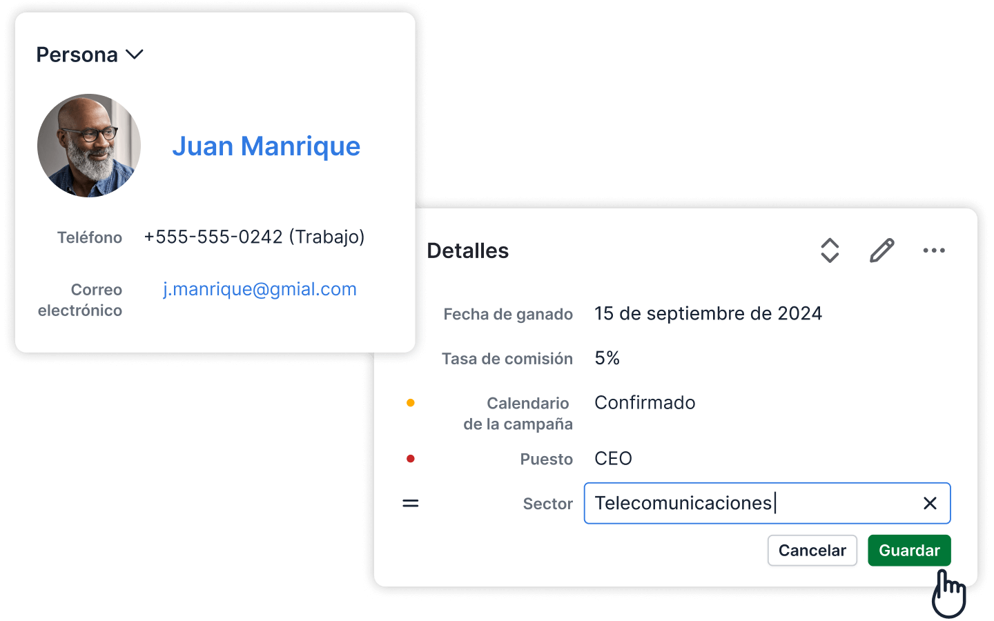 Adapta tu CRM a tu negocio con campos personalizados. Captura información imprescindible para tu equipo de ventas y automatiza cálculos con fórmulas inteligentes.