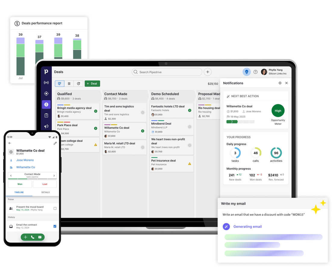 Take advantage of Pipedrive’s precise, real-time data analytics to track sales metrics and fine-tune your strategy.