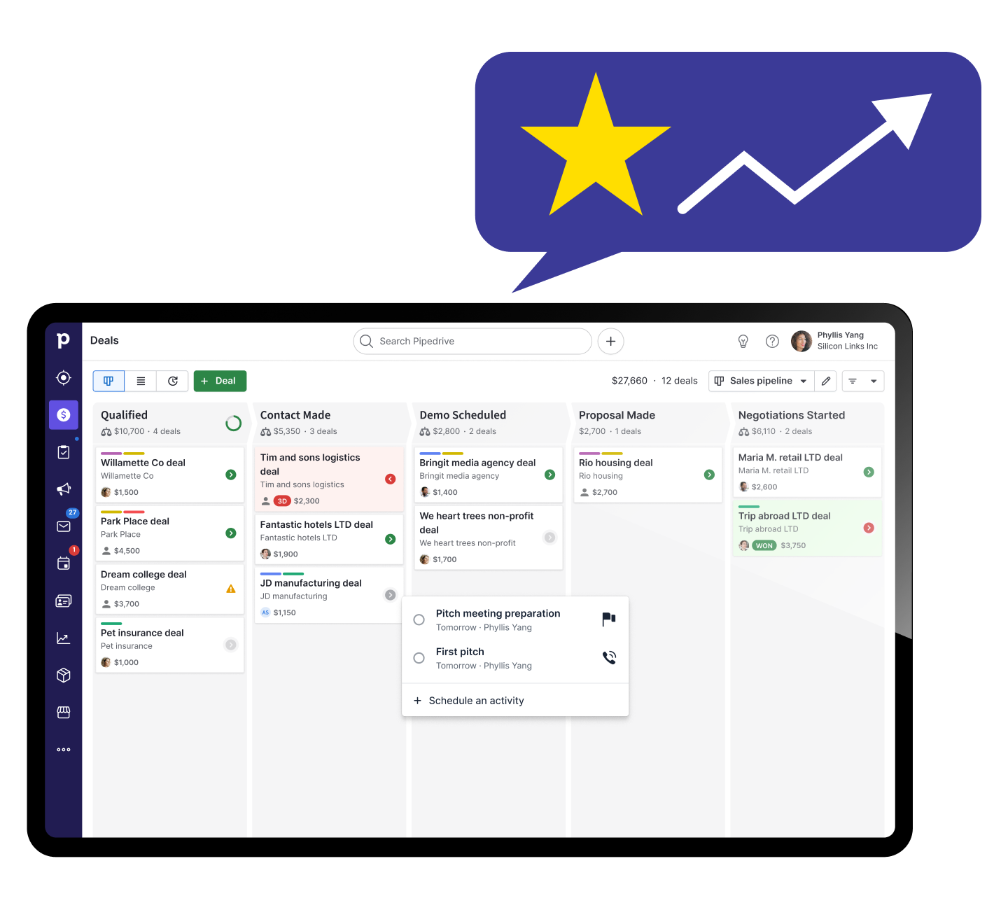 スタートアップ向けCRMは、新規事業の成長に集中することを可能にします。単一のプラットフォームでパフォーマンスを監視できるため、事業を成長させる機会を特定できます。Pipedriveは、目標達成に向けて常に目標を意識できるように支援します。